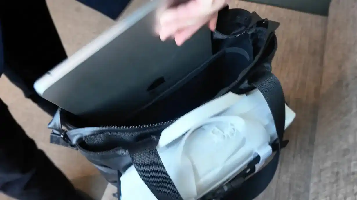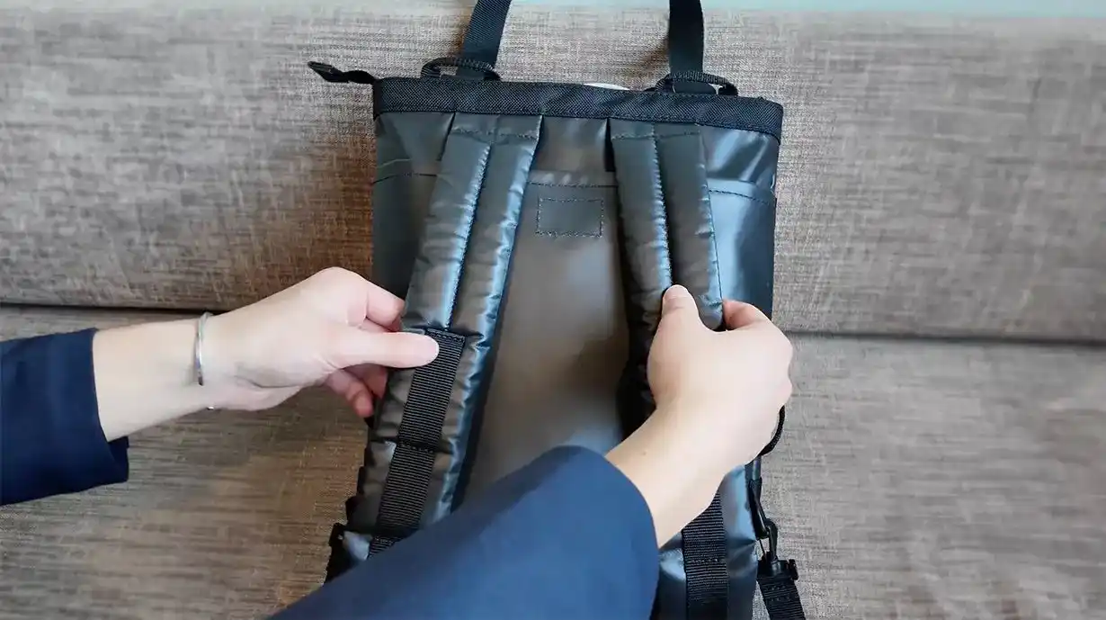 | 背面に収納されているショルダーストラップを出してパックパックとしても利用可能。 | ||||||||||||||
