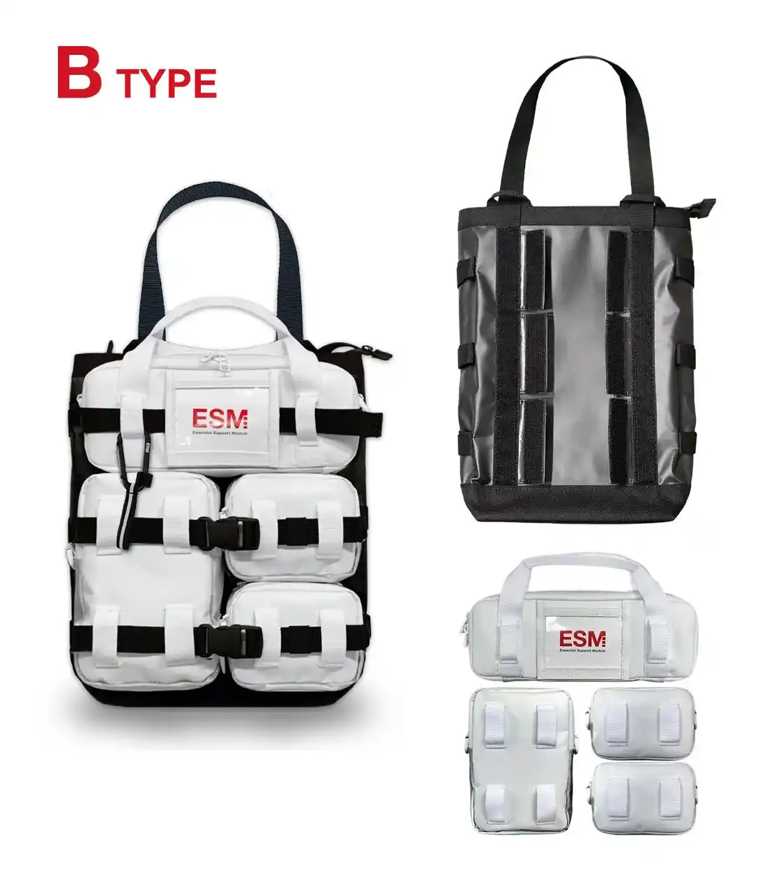 | 持ち手のついたサブバッグ一つと中型モジュールポーチ1 点、小型モジュールポーチ2 点がセットになったタイプ。作業現場やアウトドアなどのツールバッグなどに適したセットです。 | ||||||||||||||
