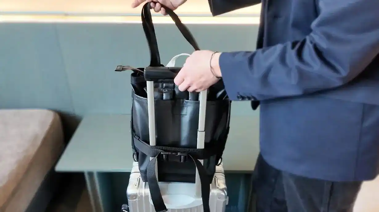 | また、モジュールを本体に装着した状態ではトートバッグとして持ち運べるほか、備え付けのショルダーストラップによりバックパックとしても使用できます。 | ||||||||||||||