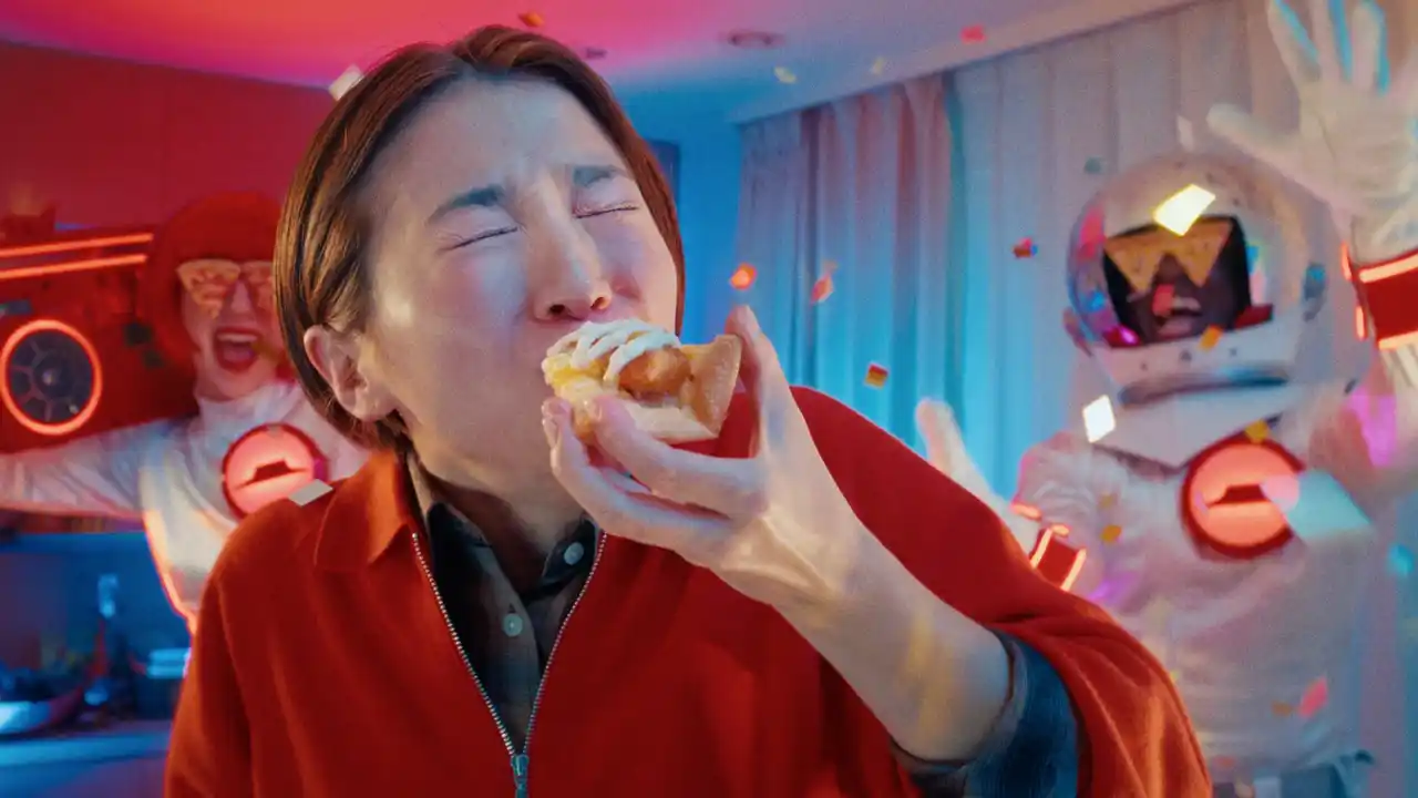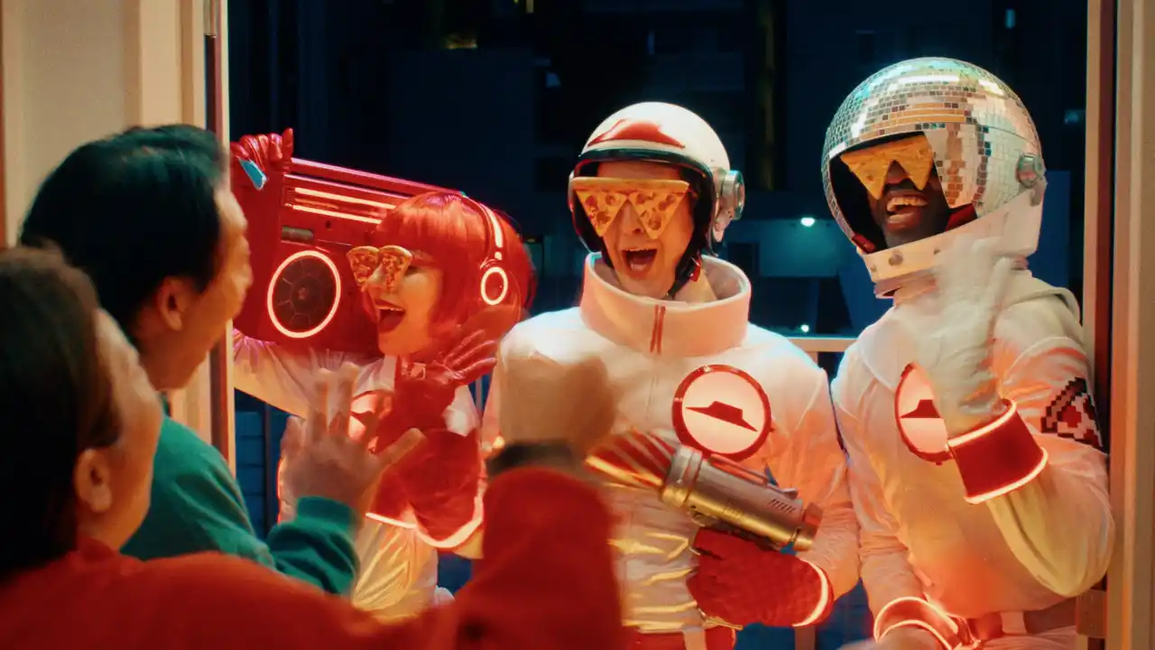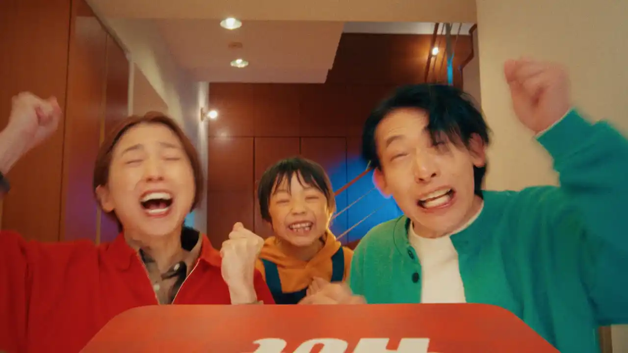 お出かけから帰宅した家族「つかれた~」と夕飯を作れる体力も残っていません。そこにピザハットロゴ型のUFOからハット星人が突如来訪!笑顔でピザを届けると、静かなリビングは「ピザだ~!」と大熱狂のパーティーフロアへ一変します。王道のマルゲリータを頬張り、家族が笑顔に包まれる後半では、「お持ち帰りなら2枚目無料♪」という軽快で耳に残るBGMにあわせて、3人が満面の笑みで店舗からピザを持って駆け出します。おいしさはもちろん、お持ち帰りならではのお得感と高揚感を、ハッピーに描いたストーリーです。 |