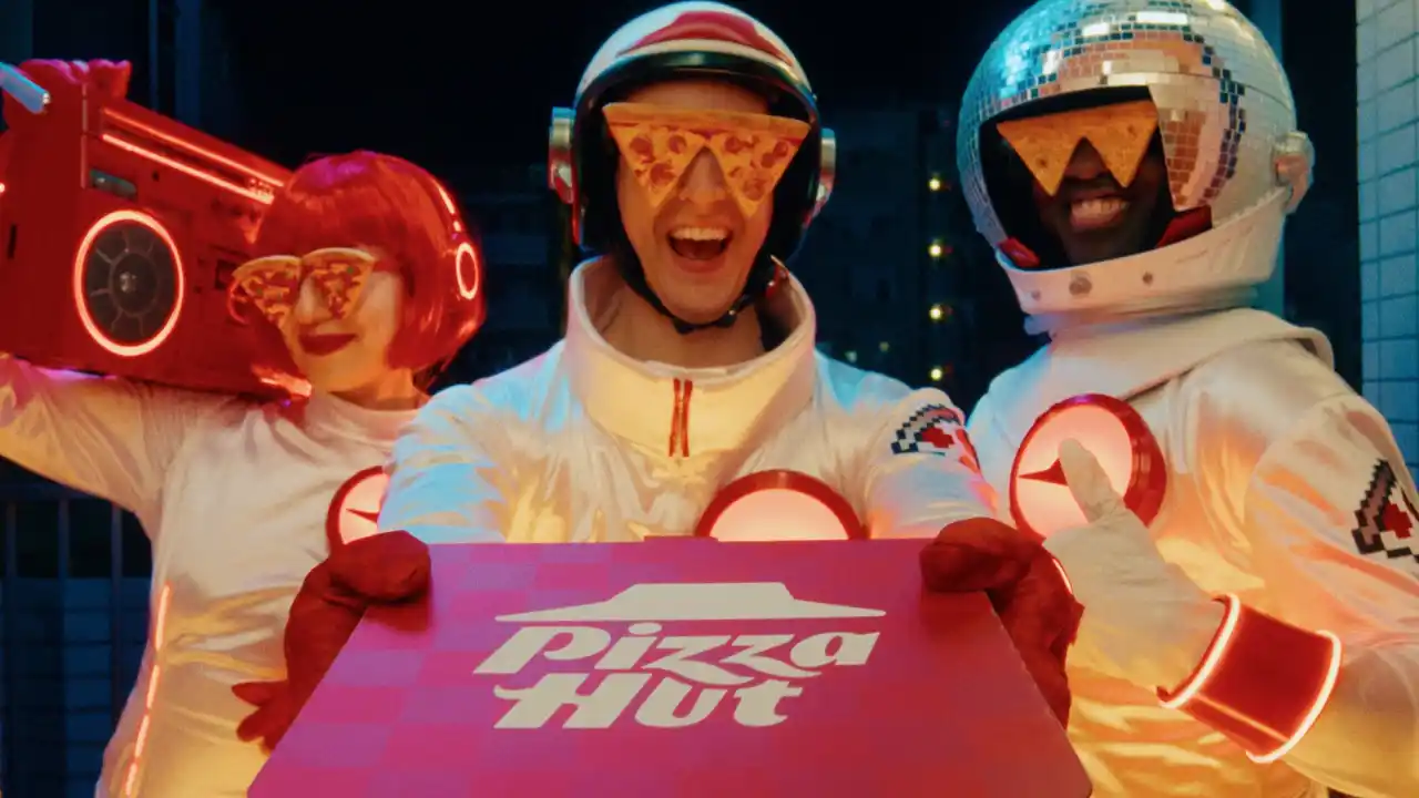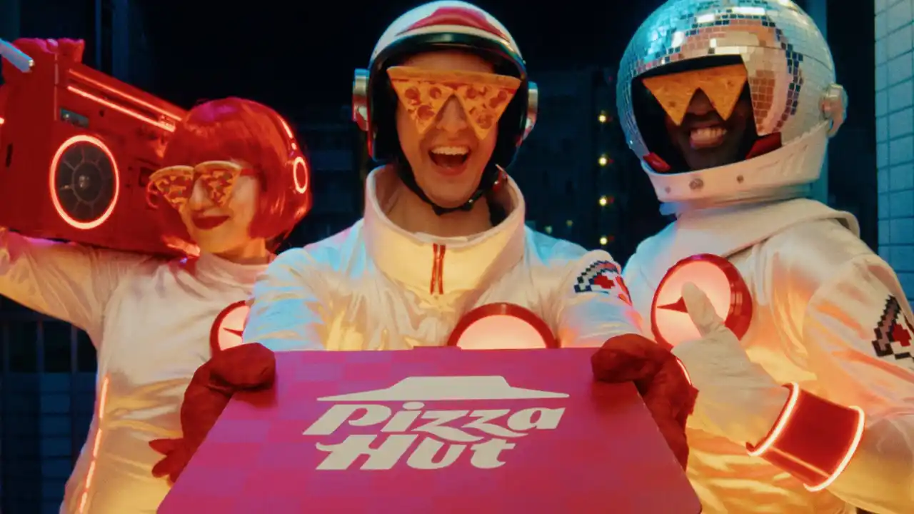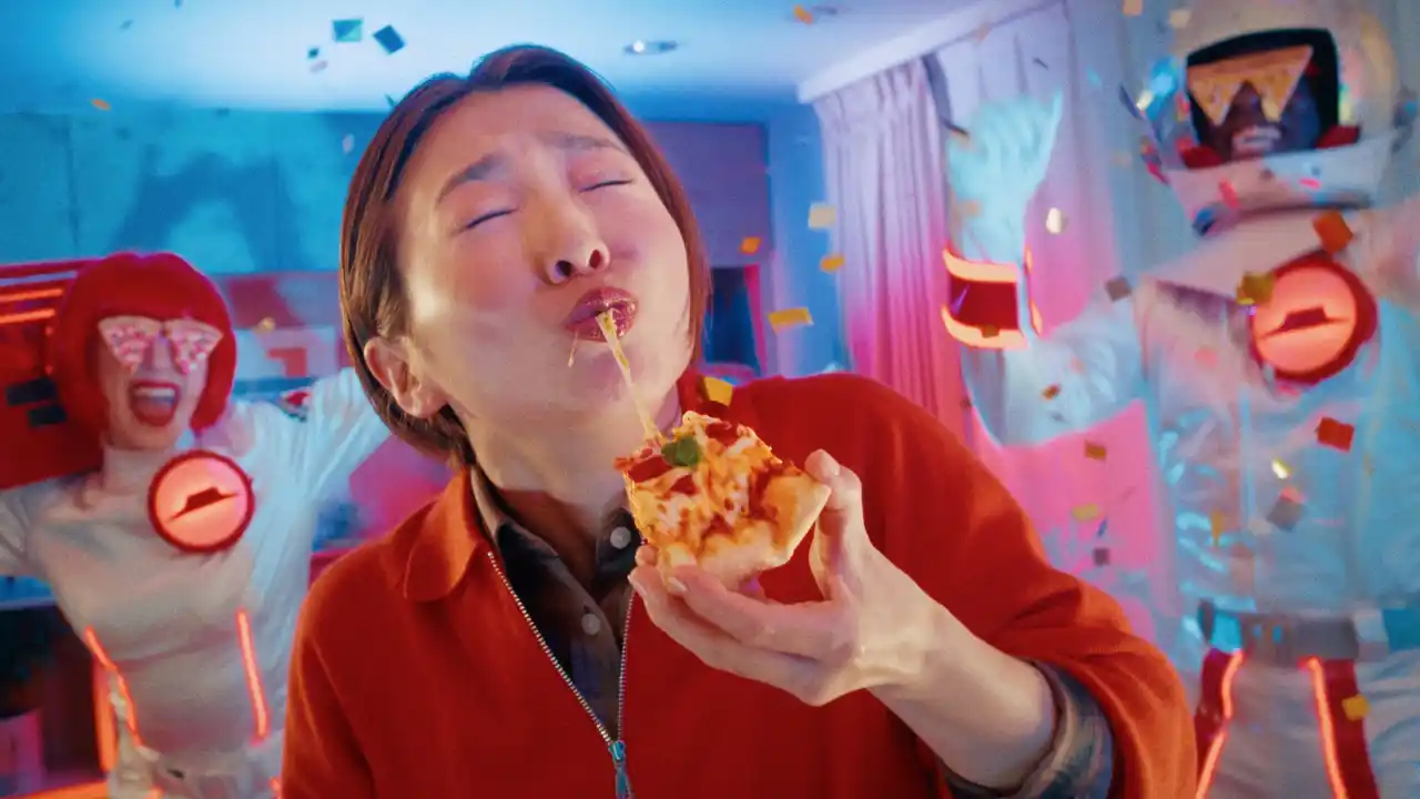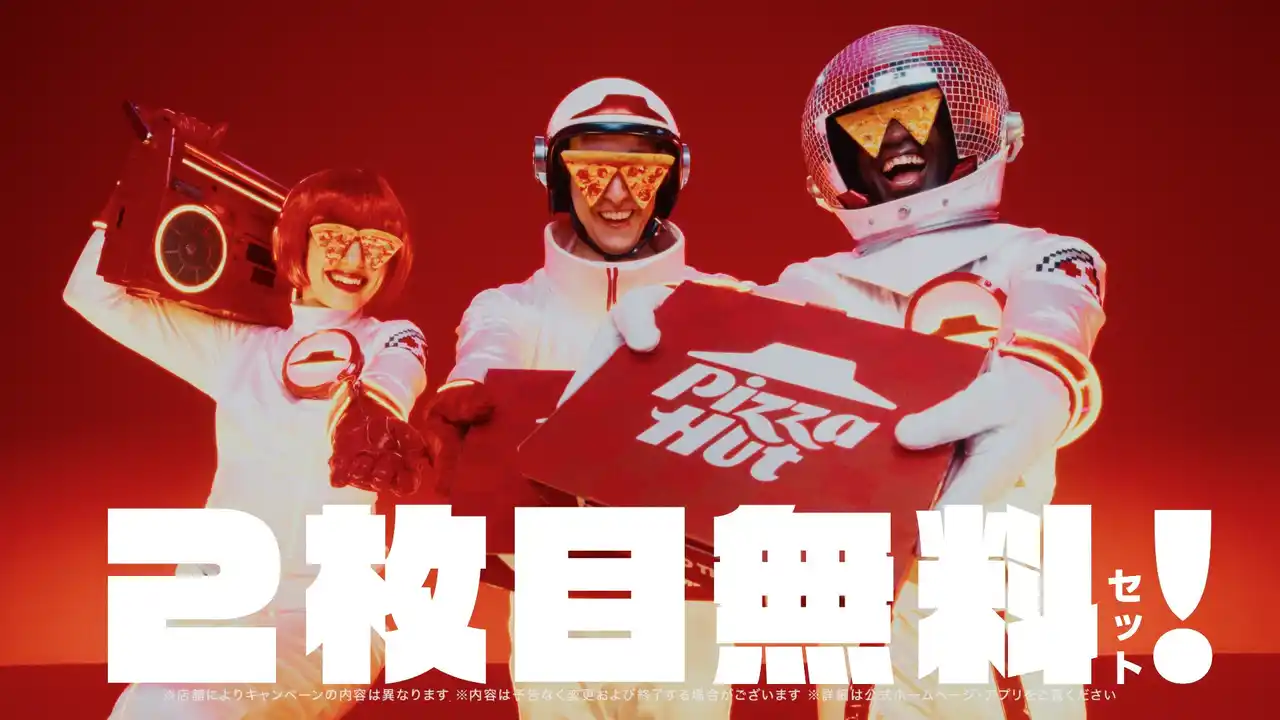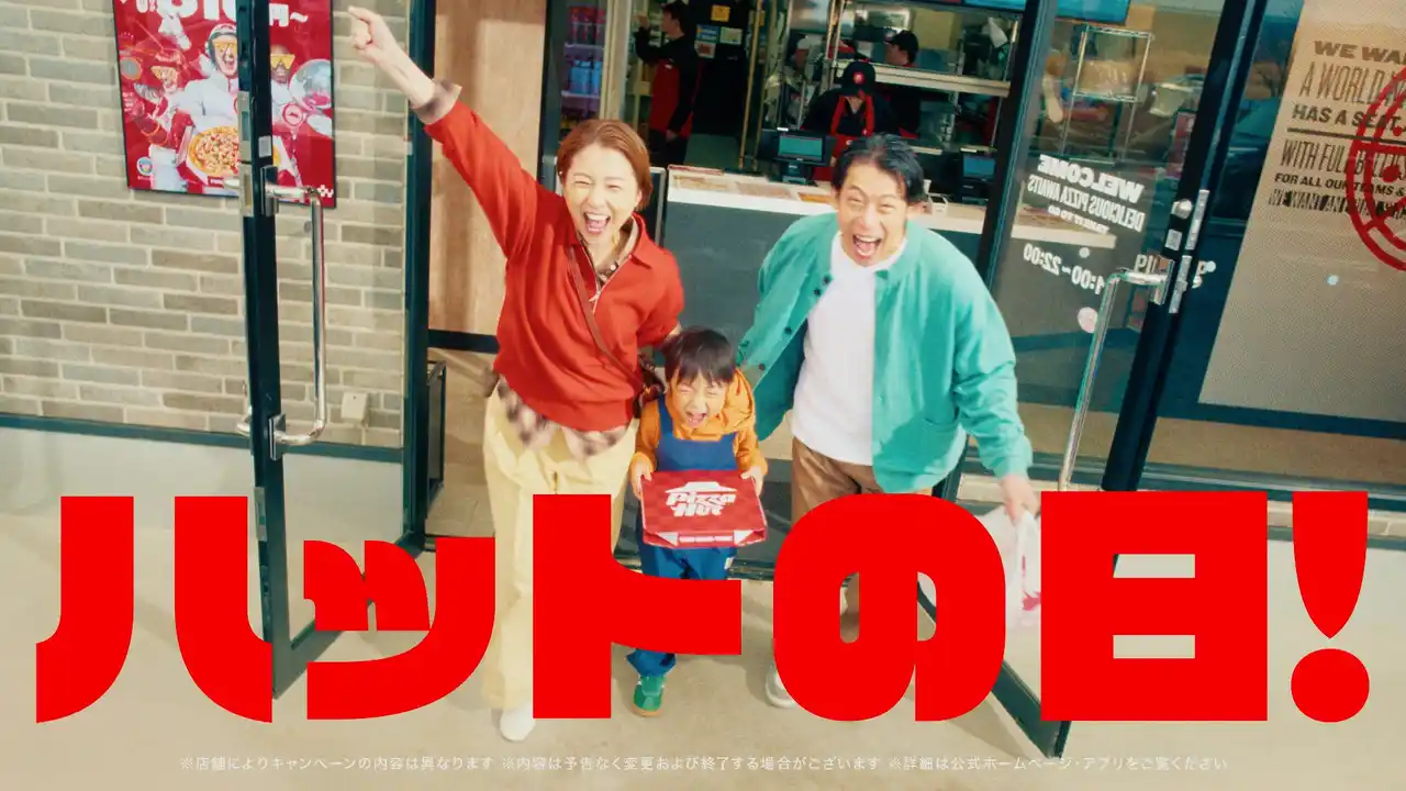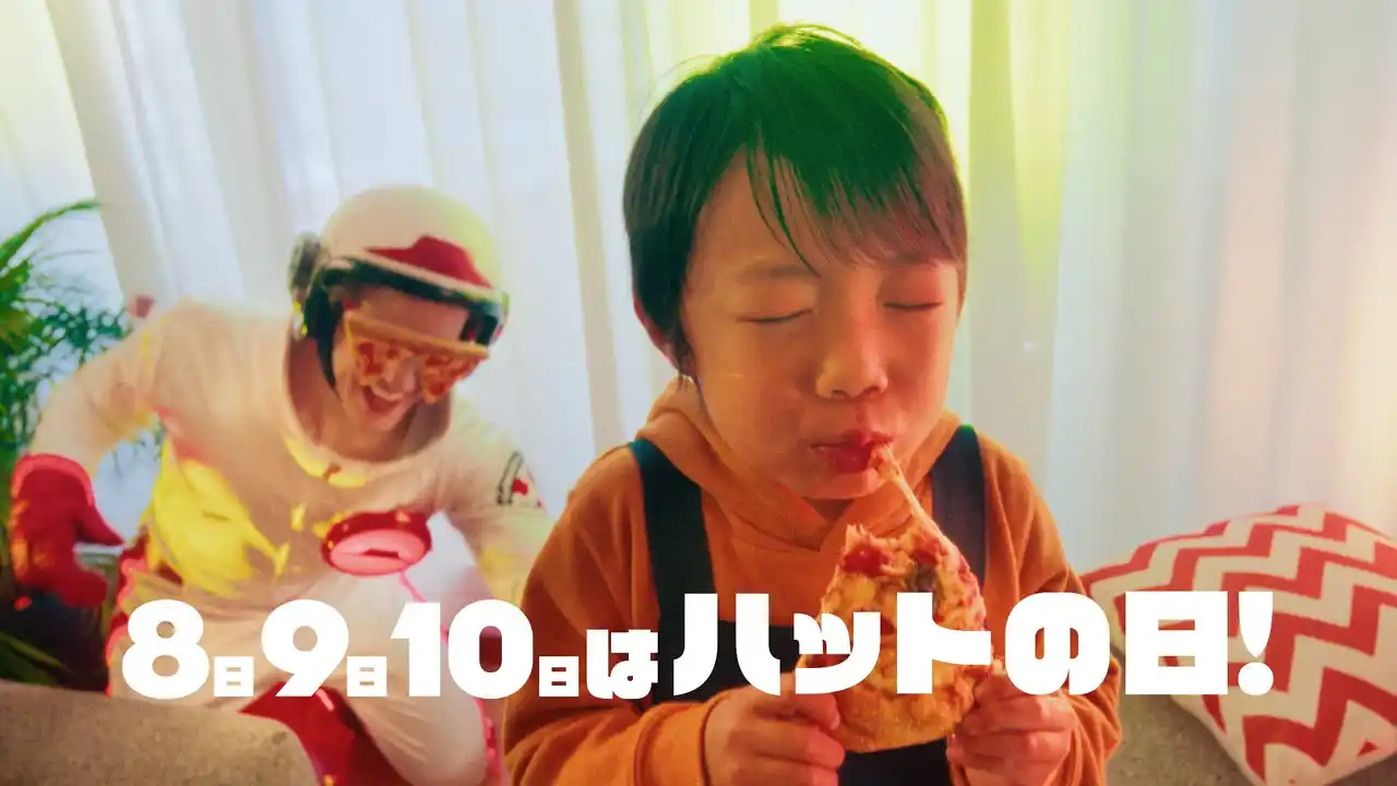 新CM「ハットの日」篇では、これまでのシリーズとは異なるポップでリズミカルな世界観の中、「ピザハット~がやってくる~♪」という耳に残るBGMに合わせてハット星人が軽快なダンスを披露します。続いて、「8・9・10はハットの日~!」というフレーズとともに、家族3人がピザをテイクアウトしてうれしそうに店を後にするシーンを展開。後半では、家族それぞれがピザを頬張るおいしそうなカットがテンポよく映し出され、最後は「ピザピザピザピザ お持ち帰りなら810円!」というリズミカルなフレーズで締めくくられます。楽しい音楽と軽快な演出を通じて、「ハットの日」のお得感とワクワク感を印象的に伝えるCMです。 |