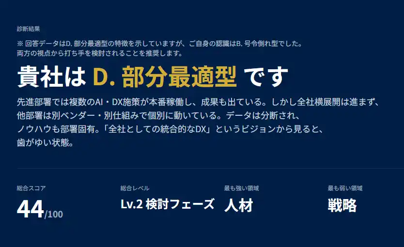 他のDX診断ツールでは『5段階のスコアが出るだけで、で、何をすべきか』が見えないものばかりでしたが、本ツールは組織タイプという切り口で、自社の状態を一言で説明してくれる点が秀逸です。 |