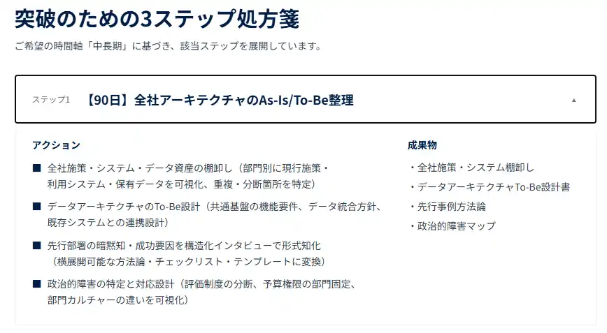 診断結果をもとに、90日以内に着手すべきこと、半年で達成すべきこと、1年で完成させるべきことを、タイプ別に具体的なアクションと成果物まで明示します。Gooserが実際のコンサルティング現場で提供している方法論を、無償で公開するものです。 |