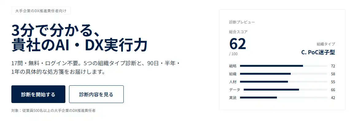 本ツールは、わずか3分・17問の回答で、貴社のAI・DX推進を「戦略/組織/人材/データ/実装」の5領域で定量評価し、パーソナライズされた改善ロードマップを無料で即時提供します。「AIに関心はあるが、何から手を付けるべきか分からない」「PoCは実施したが、本番運用に至っていない」といった課題に対し、次の一手を可視化します。 |