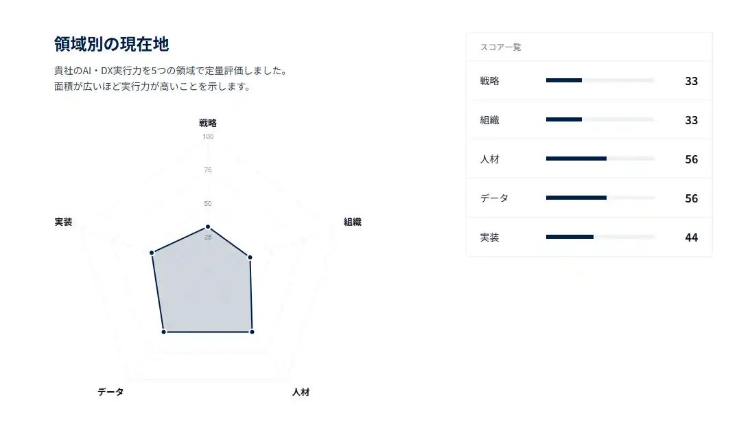AI・DX推進を「戦略/組織/人材/データ/実装」の5領域で評価。各領域を3問・4段階スケールで定量化し、レーダーチャートで現在地を可視化します。 |