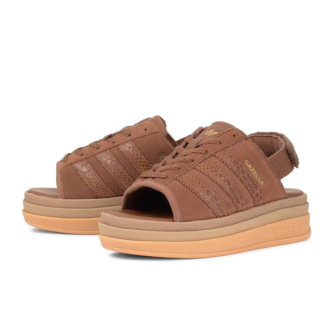 ●スウェード素材をベースにスリーストライプス部分にアニマル革風のエンボスを施した、ABC-MART限定カラーのGAZELLE BOLD SANDALは、厚底によるスタイルアップと軽やかな履き心地を両立。 |