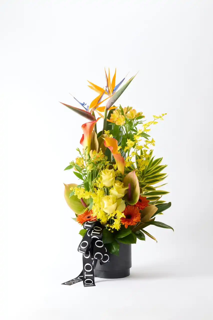 陽光を思わせるイエローやオレンジの花々が、明るく洗練された印象を演出。立体的な構成と伸びやかなラインが、空間にダイナミズムをもたらします。開店祝いやビジネスシーンなど、ポジティブなメッセージを伝えるギフトとしておすすめです。 |