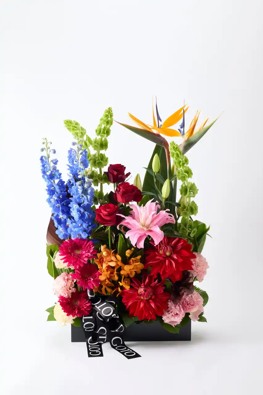 色鮮やかな花々を贅沢に束ね、咲き誇る美しさと圧倒的な華やかさを表現。豊かな彩りと伸びやかなフォルムが、空間に上質な存在感をもたらします。フォーマルな贈答や特別な記念日など、印象を強く残したいシーンに最適な一品です。 |
