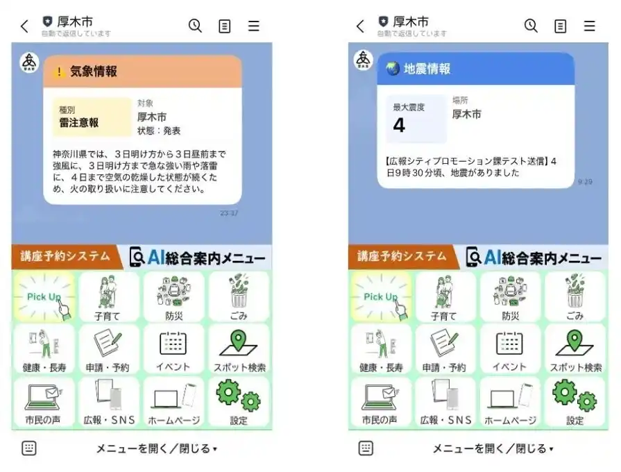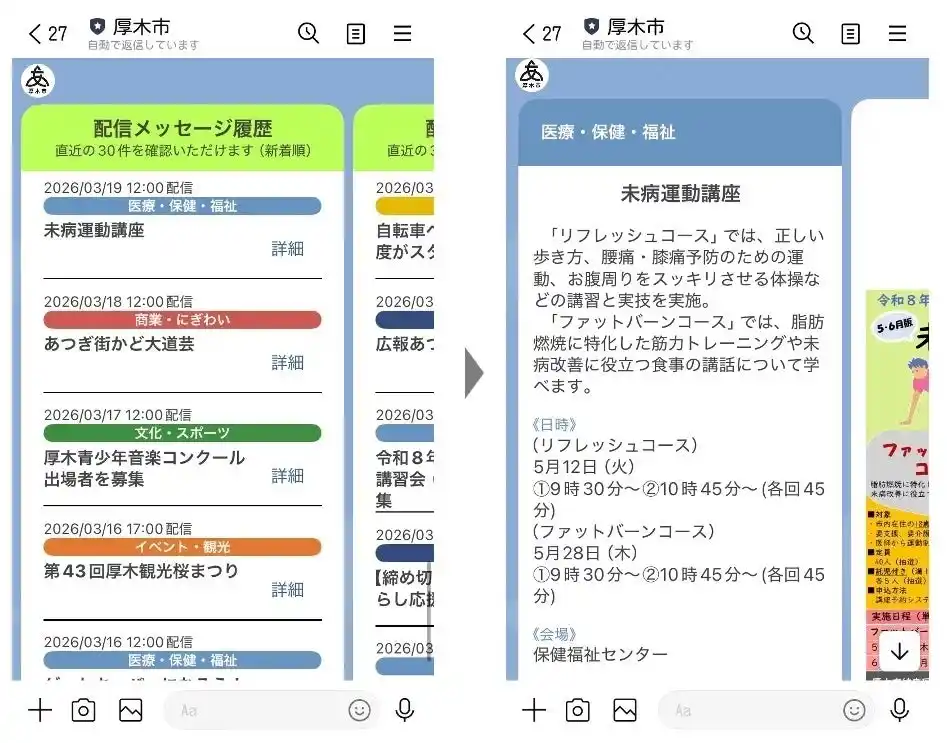神奈川県厚木市は、2020年8月にLINE公式アカウントを開設し、2023年12月にはLINE公式アカウントの拡張サービス「GovTech Express」を連携しました。連携後は、イベントや講座の予約、公共施設検索、マイタイムラインの作成、パブリックコメントの募集など、幅広い分野で活用が進んでいます。 |