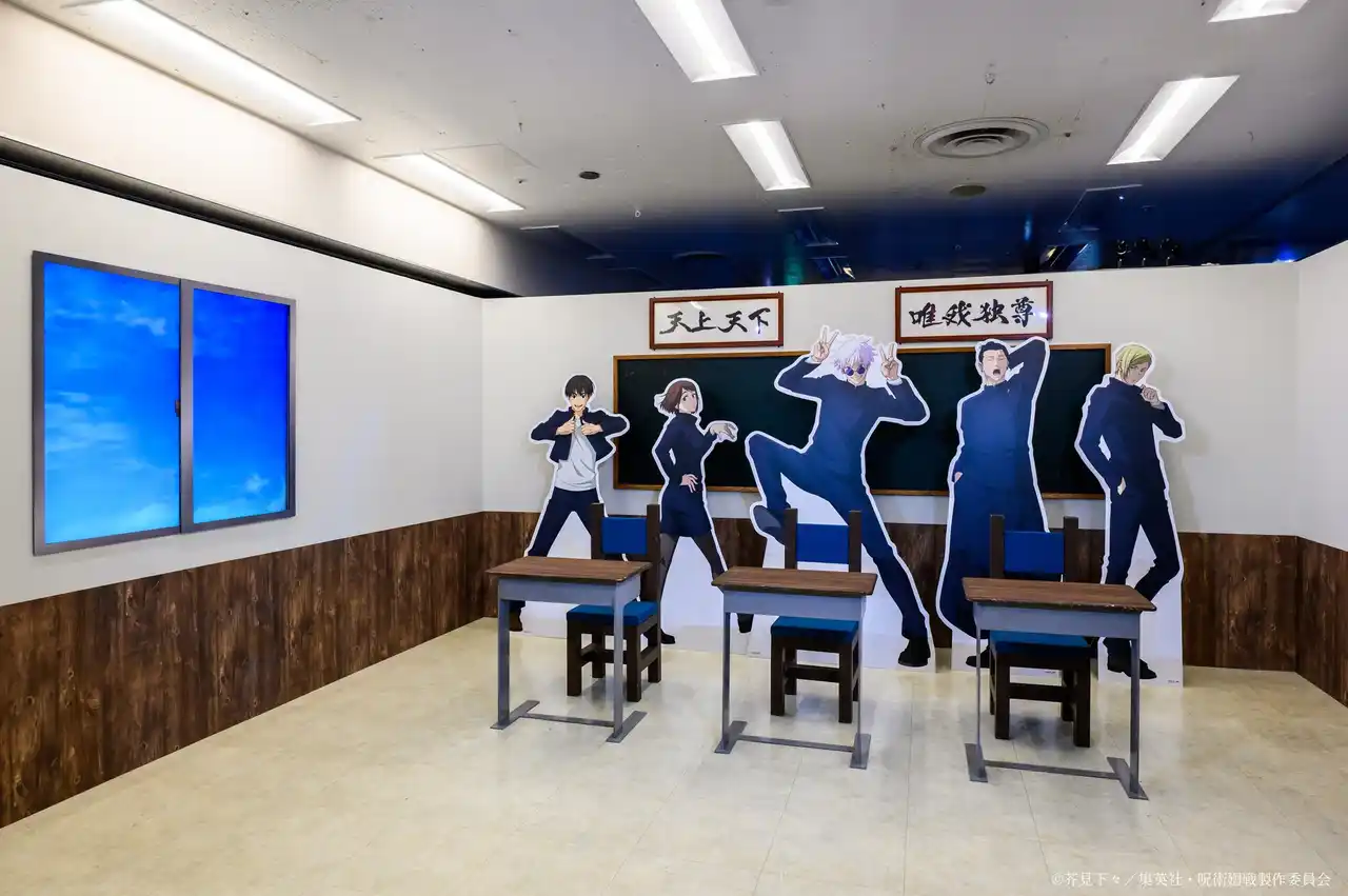 呪術高専の教室を再現したエリアには「懐玉・玉折」描きおろしイラストのスタンドパネルが並びます。窓の外を眺めていると…? |