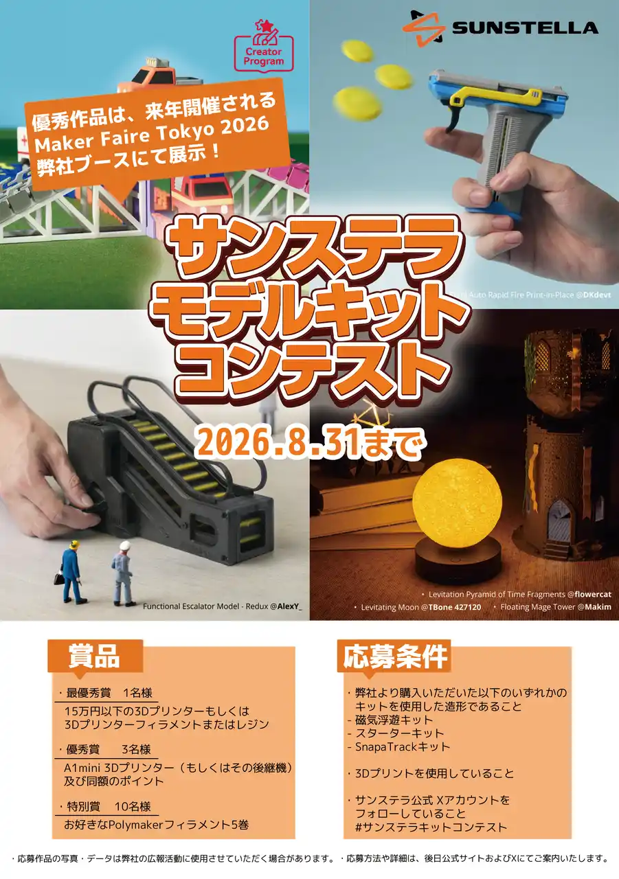 株式会社サンステラ(本社:東京都)は、3Dプリントを使った作品を募集する 「サンステラ・モデルキット造形コンテスト」を開催いたします。 |