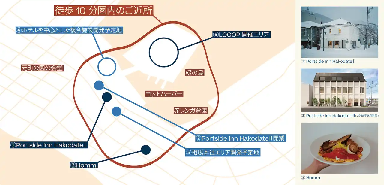 2026年9月に「Portside Inn HakodateII」(全8室+ガレット店)を開業し、既存の一日一組限定の宿と合わせて全9室の宿へ拡張。同時に、2026年2月に開業したカフェ「Homm」、そしてウォーターフロントの遊休地で計画中のホテルを中心とした複合施設を含め、Stapleが手がける拠点が徒歩10分圏内に複数点在する滞在環境が整います。