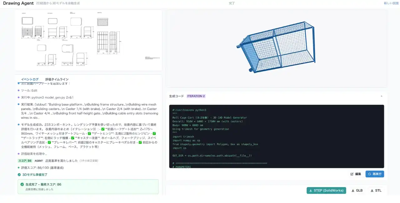 株式会社renue(本社:東京都港区、代表:山本悠介)は、2D図面から3Dモデルを自律生成するWebアプリケーション「Drawing Agent」に、OpenAIの画像生成モデル「gpt-image-2」を活用した新機能「図面クリーンアップ」を追加しました。補助線・寸法標注・ハッチング・引出線等のノイズを一括除去し、純粋な外形輪郭と材質境界線のみを抽出します。 |