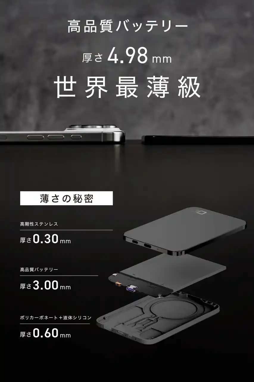 厚さ4.98mm・重さ約82gのミニマル設計。 iPhoneの背面に装着しても出っ張らない、かさばらない。持ち歩いていることを忘れるほどの世界最薄クラスのモバイルバッテリーです。 |
