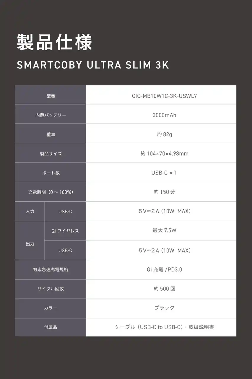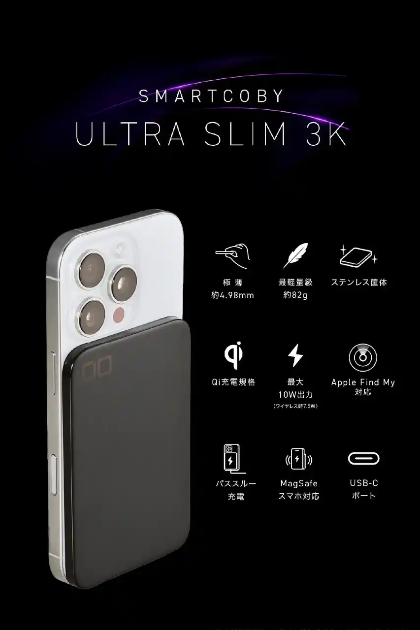 株式会社CIO(本社:大阪府守口市、代表取締役社長:中橋 翔大)は、世界最薄クラスのモバイルバッテリー『SMARTCOBY ULTRA SLIM 3K』のブラックカラーを8,980円(税込)にて、2026年4月24日(金)よりAmazon.co.jp、楽天市場のCIO公式オンラインストア、ならびに一部の家電量販店、直営店CIO STOREなどにて販売を開始いたします。応援購入サービスMakuakeにて実施したプロジェクトでは、3,800人以上の方に応援購入をいただきました。 |