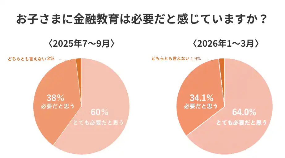 「子どもへの金融教育の必要性」を質問したところ、64%が「とても必要と思う」、34.1%が「必要と思う」と回答しました。2025年7月~9月の前回調査と比較すると、総数(98%)は変わらないものの、「とても必要」と答えた層が60%から64%へ増加。 こども支援NISAの制度創設や続く物価高、日経平均株価の史上最高値更新といった社会情勢を背景に、保護者の危機感や関心が一段と強まっていることが伺えます。 |