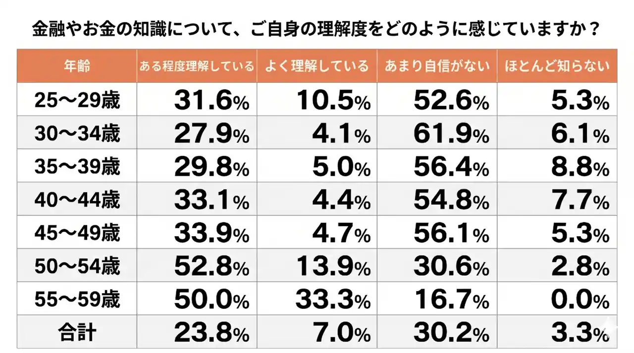 また、年齢別のデータを見ると、年齢が上がるにつれて「理解している」とする回答が増加する傾向にあり、55~59歳では「よく理解している」「ある程度理解している」の合計が83.3%に達し、全世代で最も高い理解度を示しました。 |