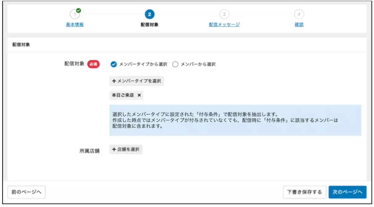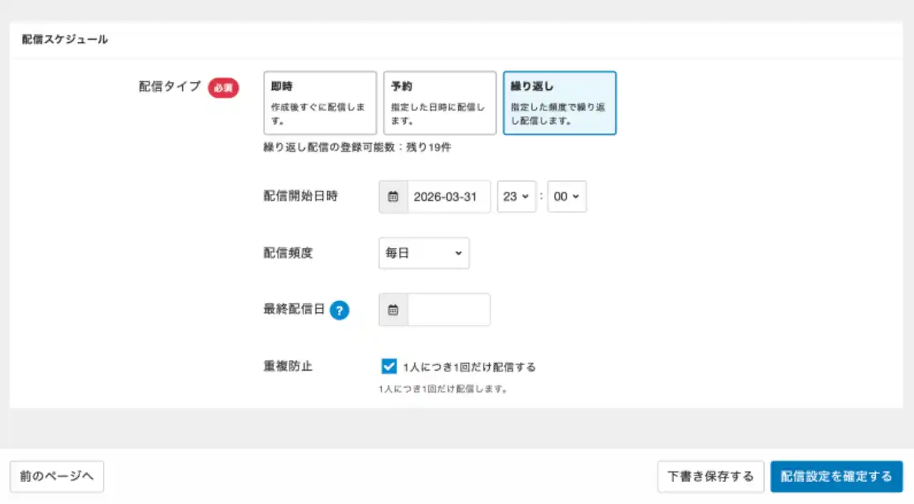 配信タイミングは「即時」「予約」「繰り返し」から選択できます。 特に「繰り返し」は、一度設定すれば自動で定期的な配信が可能となり、作業の負荷を大幅に軽減します。これにより、日々の会員フォローを抜け漏れなく、継続して運用できます。 |