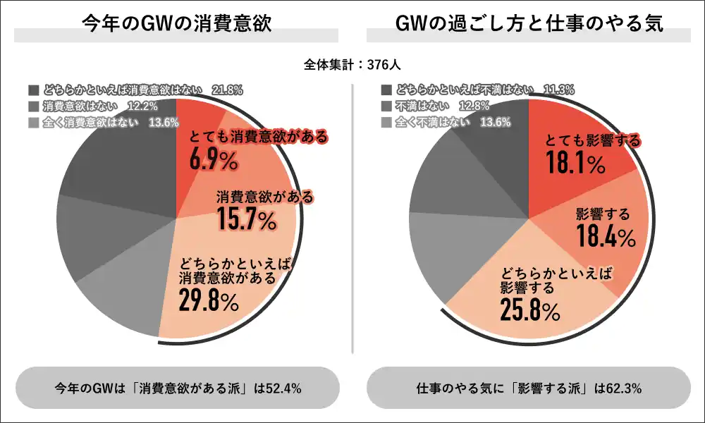 【GWの消費意欲】 回答者全体の376人に、今年のGWの消費意欲を聞くと、「消費意欲がある派」は52.4%で過半数を占め、内訳は「とても消費意欲がある」が6.9%、「消費意欲がある」が15.7%、「どちらかといえば消費意欲がある」が29.8%でした。また、GWの過ごし方が仕事のやる気に影響するかを聞くと、「影響する派」は62.3%で過半数を占め、内訳は「とても影響する」が18.1%、「影響する」が18.4%、「どちらかといえば影響する」が25.8%でした。 |