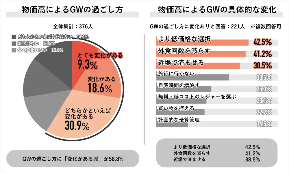 【物価高とGWの過ごし方の関係】 回答者全体の376人に、物価高の影響で GW の過ごし方に変化があるかを聞くと、「変化がある派」が58.8%で過半数を占め、内訳は「とても変化がある」が9.3%、「変化がある」が18.6%、「どちらかといえば変化がある」が30.9%でした。物価高によってGWの過ごし方が変わったと回答した221人にその内容を聞くと、「より低価格な選択」が42.5%で最多となり、次いで「外食回数を減らす」が41.2%、「近場で済ませる」が38.5%となりました。 |