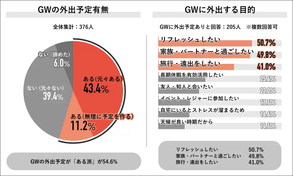 【GWの外出予定有無】 回答者全体の376人に、GWの外出予定有無を聞くと、「ある派」が54.6%で過半数を占め、内訳は「元々ある」が43.4%、「無理に予定を作る」が11.2%でした。外出予定ありと回答した205人にその目的を聞くと、「リフレッシュしたい」が50.7%で最多となり、次いで「家族・パートナーと過ごしたい」が49.8%、「旅行・遠出をしたい」が41.0%となりました。 |