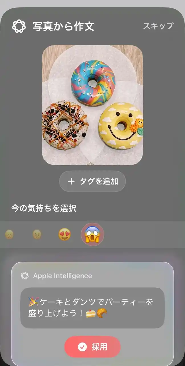 Appleが提供するパーソナルインテリジェンスシステム「Apple Intelligence」を活用し、風景を撮って絵文字で気分を選ぶだけでAIが言葉に変えます。わずか4タップで街歩きを妨げない投稿が可能です。 |