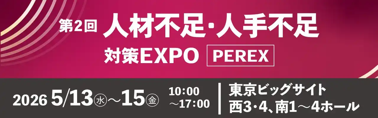人材不足・人手不足 対策EXPO 実行委員会(実行委員長堀正人、運営(株)イノベント)は、2026年5月13日(水)~15日(金)に東京ビッグサイトで「第2回 人材不足・人手不足 対策EXPO [ PEREX ]」を開催します。本展は、製品・サービスの展示にとどまらず、業界のトップ専門家による特別講演、 「参加型企画」を通じて、即実践できる知識と体験が得られる展示会です。