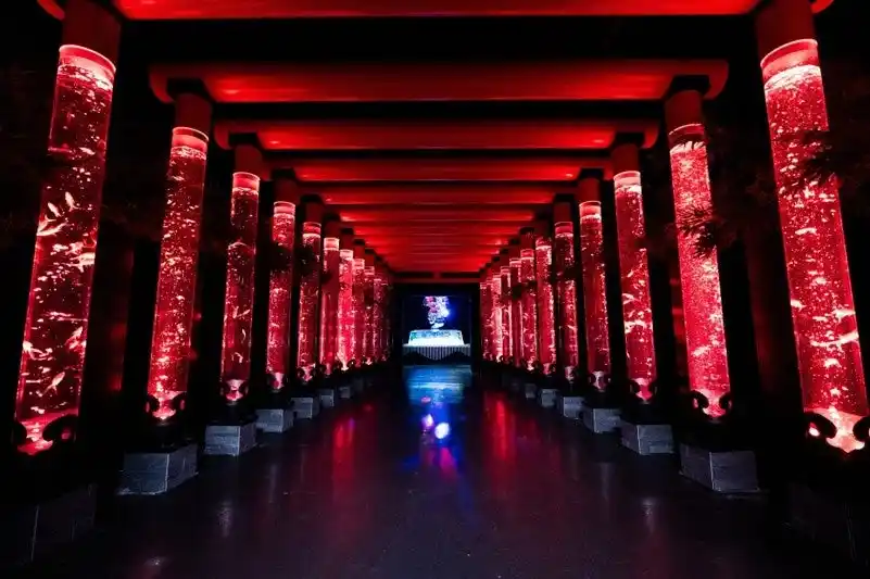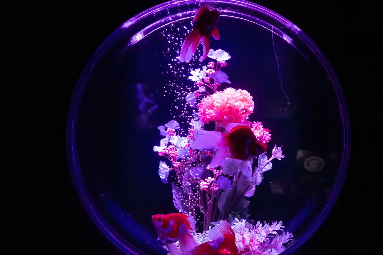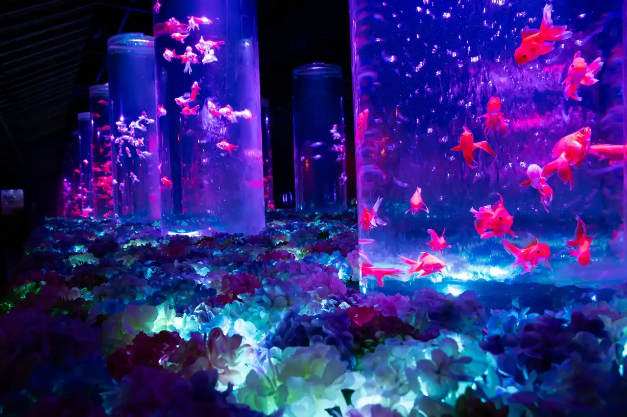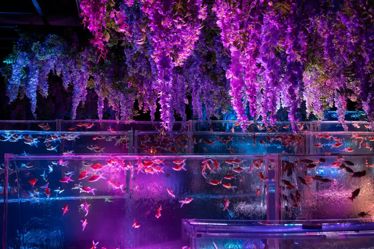 紫色に染まる空間のなかを金魚が優雅に泳ぎ、艶やかな景気に包まれる体験をお楽しみください。 |