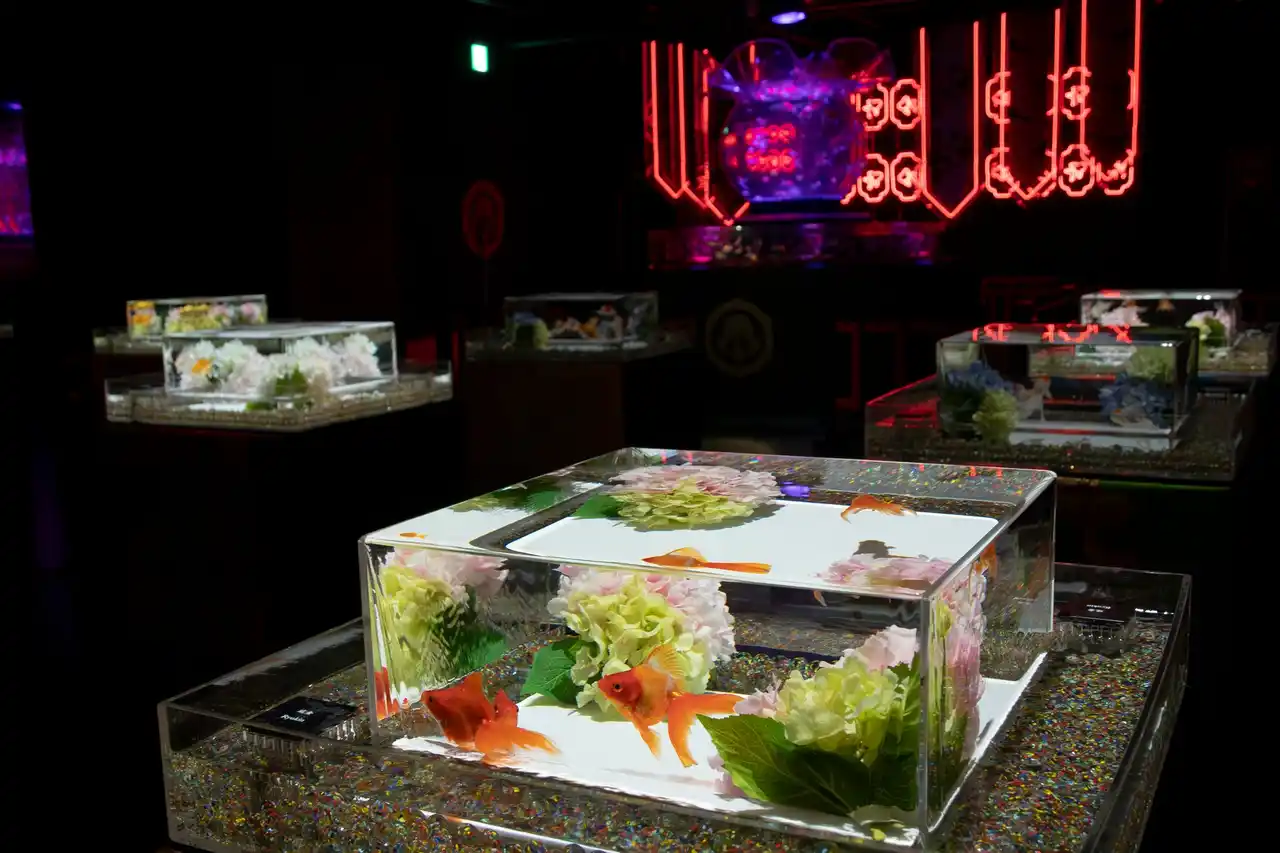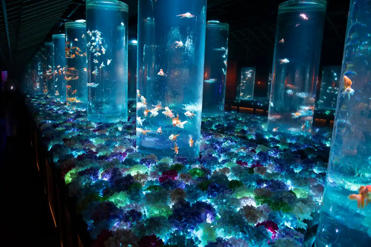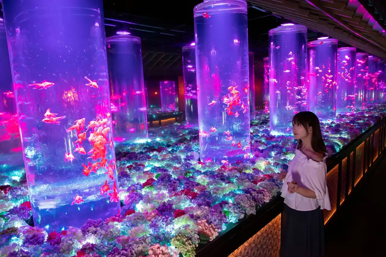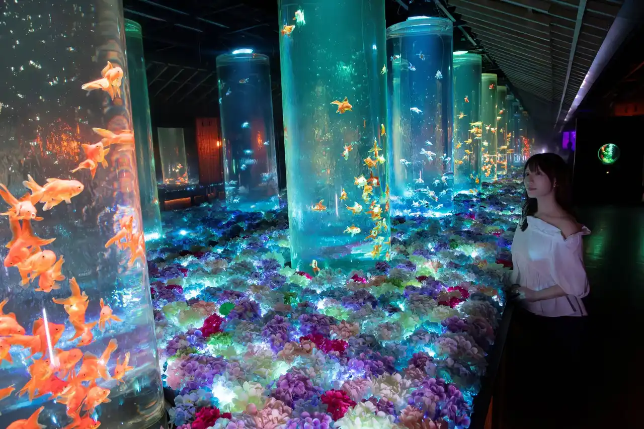 水槽作品の造形美、空間演出、そしてさまざまな美しさをもつ約70種、3000匹の金魚たちがつくりだす幻想空間が広がります。2007年以来、累計集客実績1,300万人(2025年10月現在)を誇るエンターテインメント型美術館です。 |