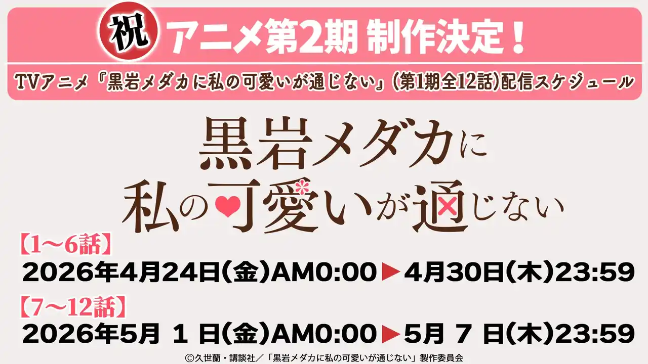 TVアニメ『黒岩メダカに私の可愛いが通じない』 (第1期全12話) 配信スケジュール |