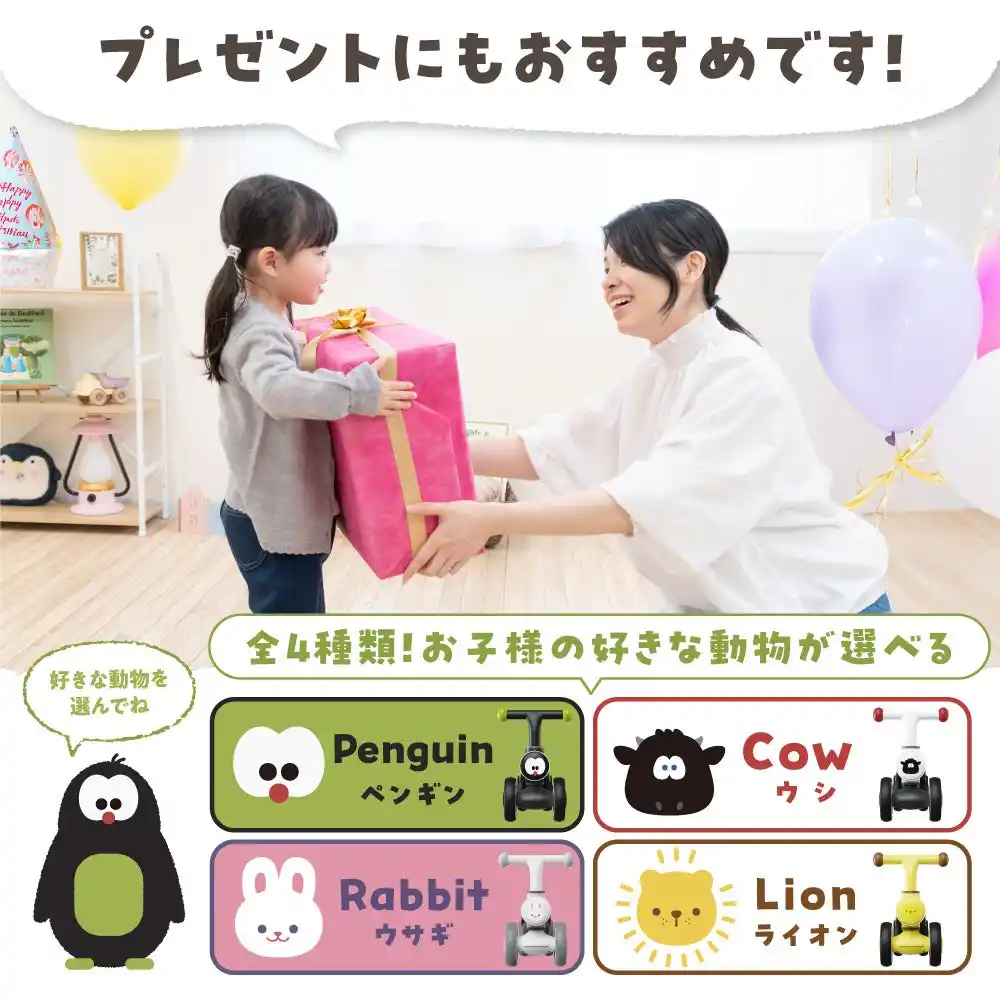 1歳の誕生日プレゼントや入園祝いとしても人気の高い『ちびっこライダー』が、新たな安全基準に対応したことで、より一層ギフトとしても選びやすくなりました。 |