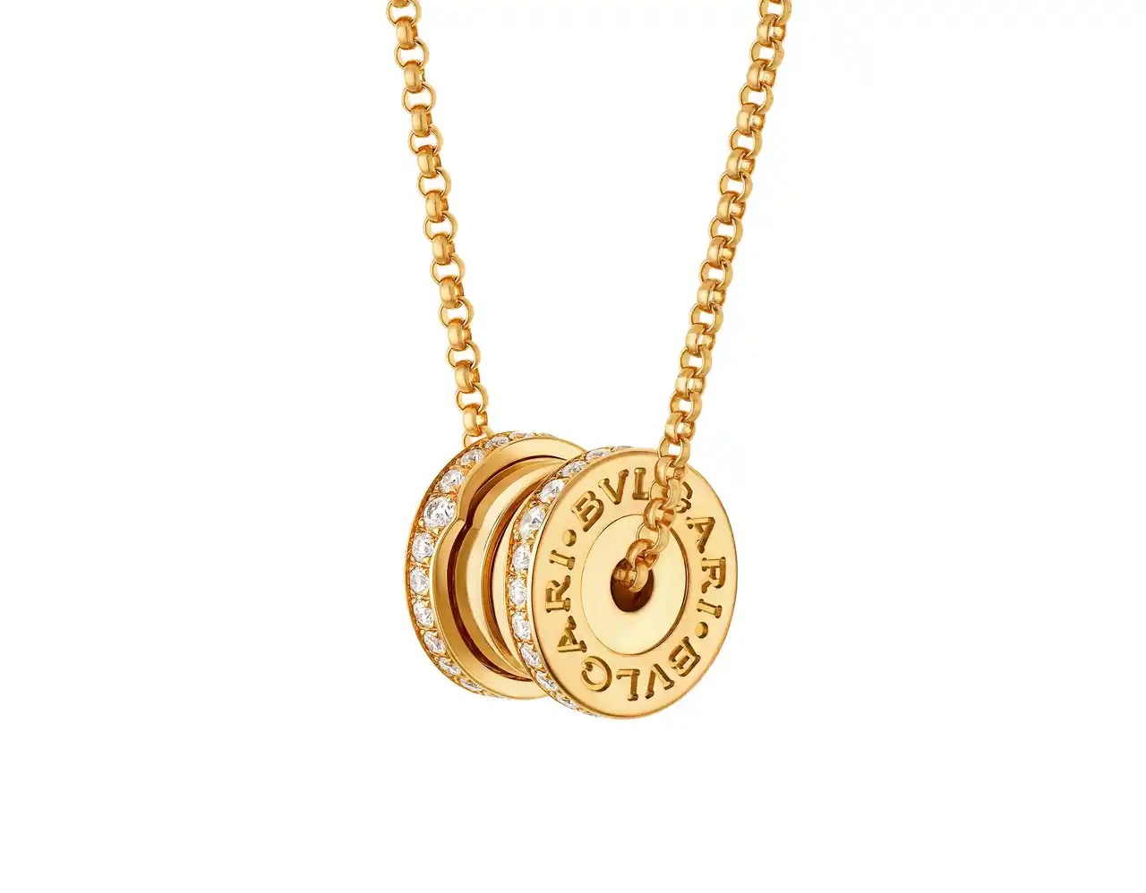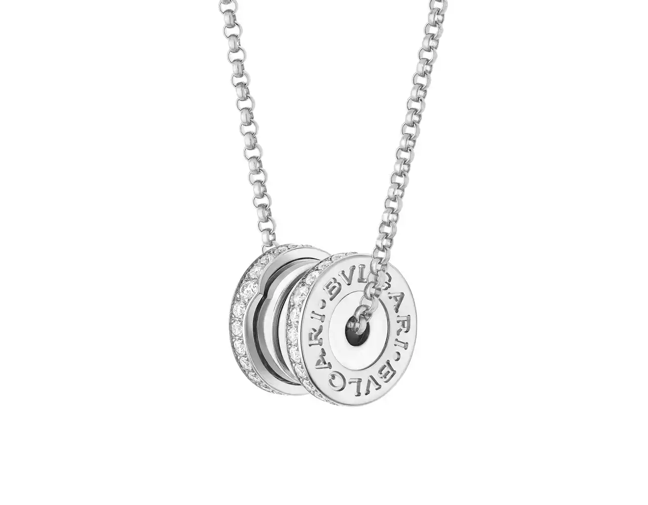 新作のネックレスは、ビー・ゼロワンの建築的な核となるデザインを、軽やかさと均衡の取れたプロポーションで再解釈しました。洗練されたチェーンから吊るされ、サイドにはダイヤモンドパヴェがさりげなくあしらわれることで、デザインに現代的な輝きを添えています。 |