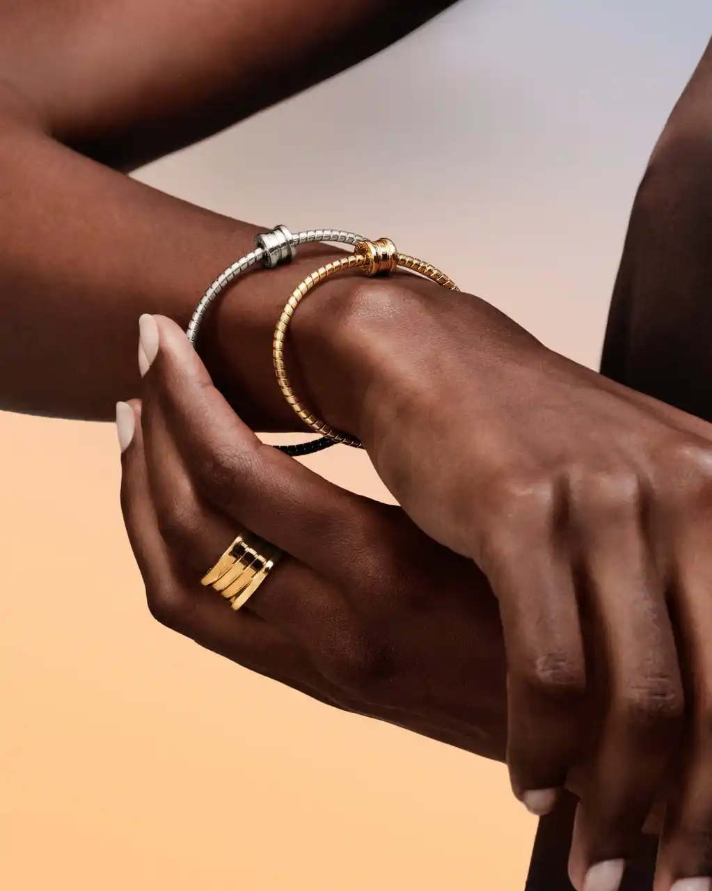 ホワイト、イエロー、ピンクゴールドで展開されるこのブレスレットは、単独でも重ね付けでも楽しめ、現代ジュエリーにおけるビー・ゼロワンの柔軟で、個々のスタイルに合わせた楽しみ方を提案します。 |