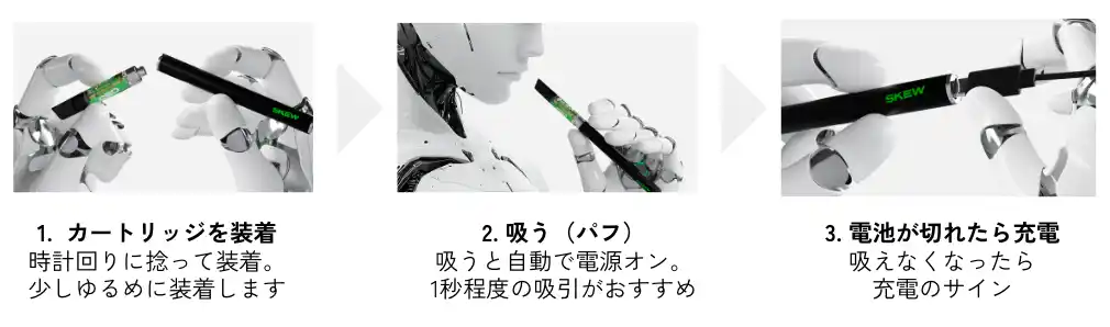 skewヴェポライザー(本体)に、CBDリキッド(カートリッジ)を装着することでご使用いただけます。 |