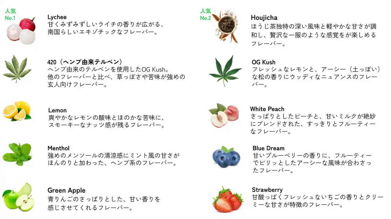 天然原料のテルペンをブレンドした、14種類(2025年7月時点)のフレーバーを展開。何度も試作を重ねたこだわり抜いた原料と 配合で、お気に入りのフレーバーが見つかること間違いなし。 |