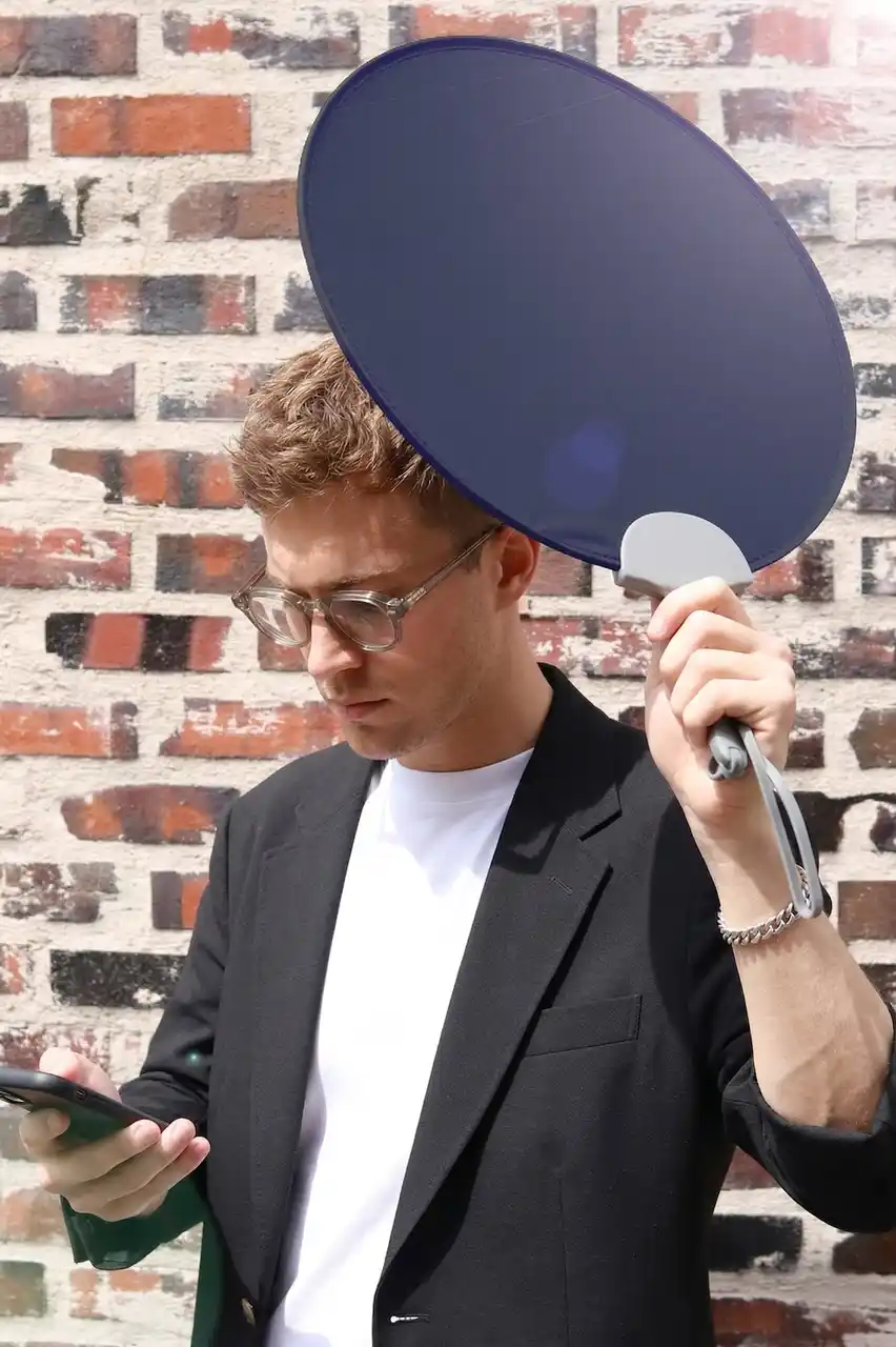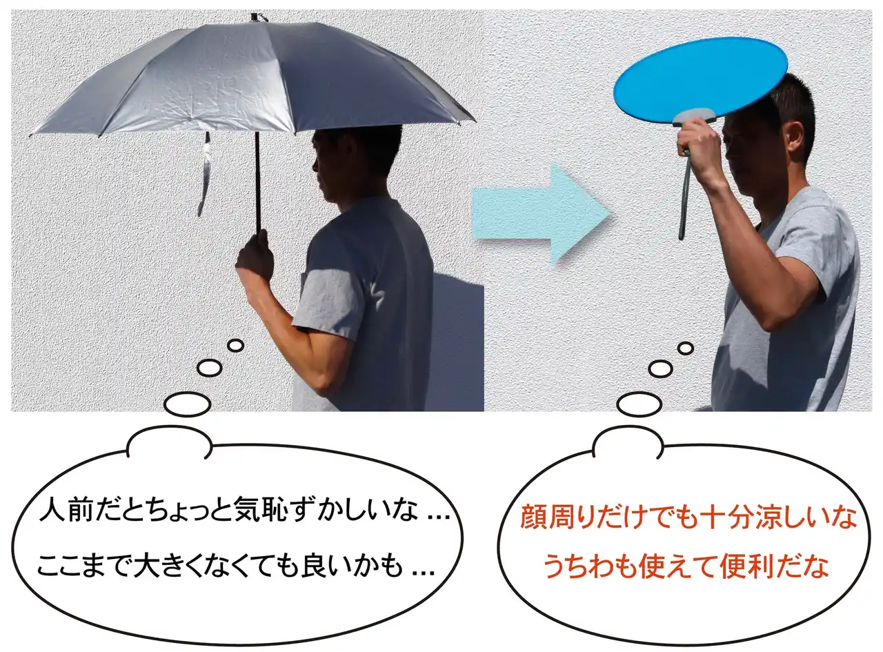 解決策としてのポントシェード: 「日傘を差す」のではなく、「高機能なうちわを掲げる」という新発想。うちわの延長線上でさりげなく使えるので男性の心理的・物理的なハードルを下げました。 |