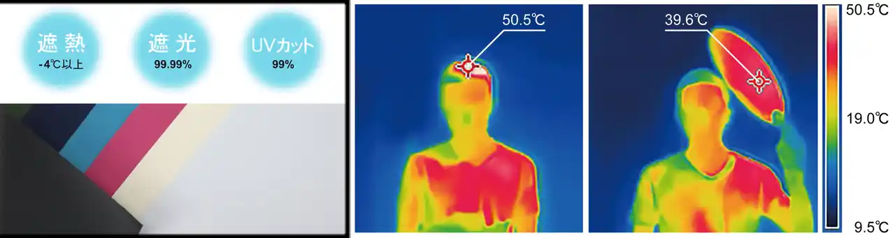 1. 東レ「サマーシールド」採用 東レが手掛ける国産生地の「サマーシールド」を採用。特殊な三層構造で、太陽光の 赤外線・紫外線・可視光線をしっかり遮断!高い遮光性99.9%(JIS L 1055A法)・ UVカット率99%、遮熱性-4°C以上(レフランプ法)・耐水圧20,000m性能を兼ね備えた生地です。 |