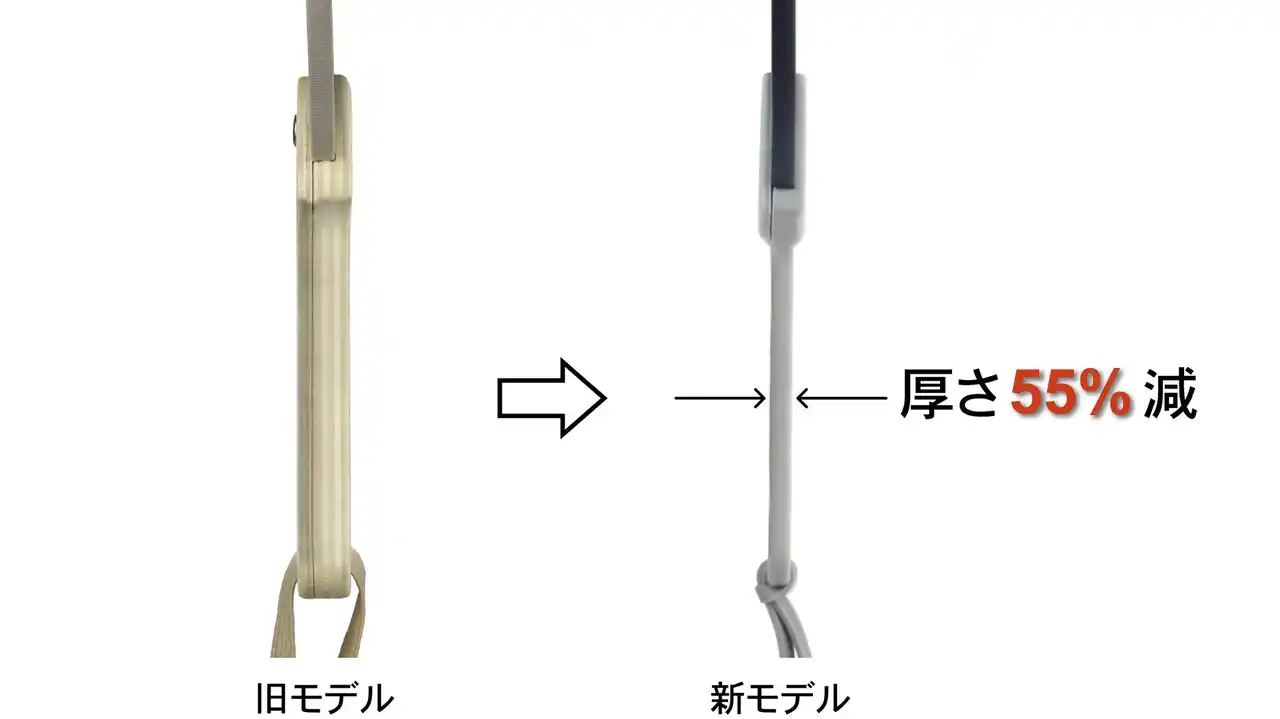 2. 厚み55%カットの薄型化 持ち手を木製から樹脂製にアップグレードし、おにぎりより軽い「70g」、携帯に便利な「厚さ3cm」を実現しました。 |
