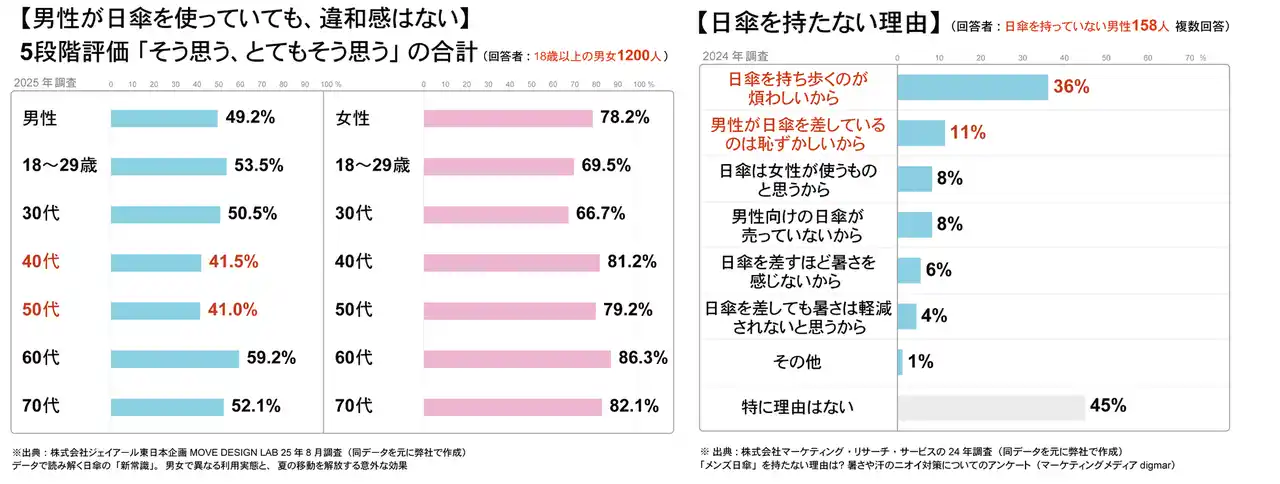 調査結果: 男性の約半数が「他人の日傘使用には違和感がない」と答えながら、自身が使わない理由として「持ち歩きが煩わしい(36%)」「差すのが恥ずかしい(11%)」と回答。 |