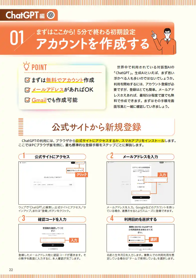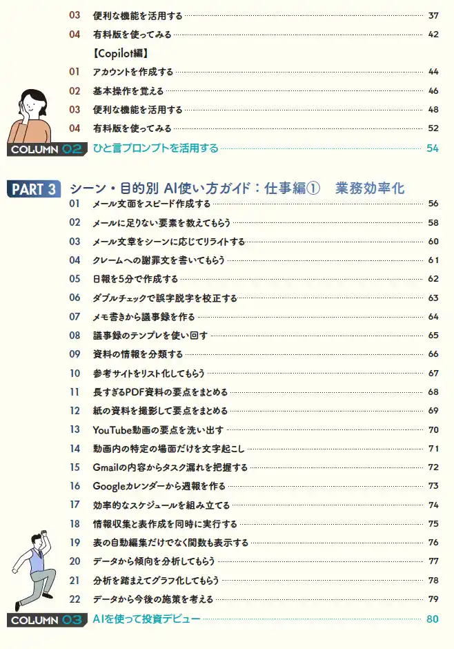 ◆PART3「シーン・目的別 AI使い方ガイド:仕事編1. 業務効率化」 PART4「シーン・目的別 AI使い方ガイド:仕事編2. クリエイティブ」 PART5「シーン・目的別 AI使い方ガイド:日常生活編」 |