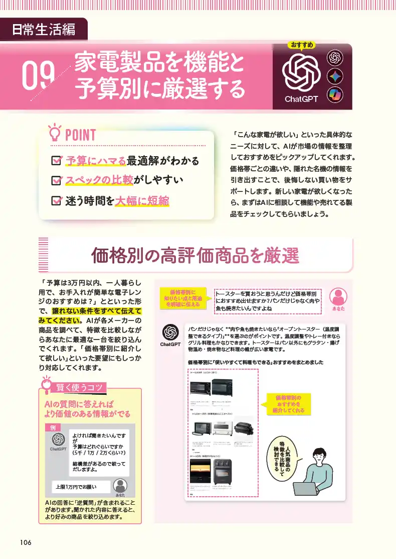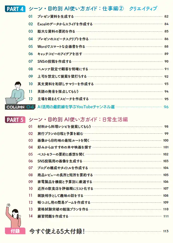 さらにPART3~5では、業務効率化、AIクリエイティブ、日常生活といったシーン別に、 |