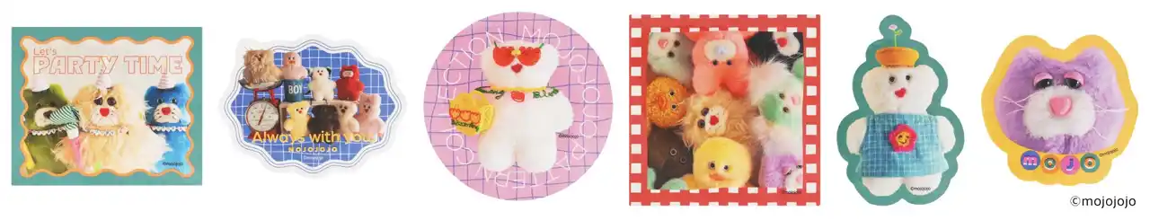 ラインナップは、シールやメモ、ノートなどの紙もの文具を中心とした全8アイテムです。レトロなカラーリングの柄や模様とmojojojoの世界観がマッチしたかわいいデザインです。シールには帽子やリボンなどのパーツの絵柄も含まれているので、着せ替えのように楽しむこともできます。 |