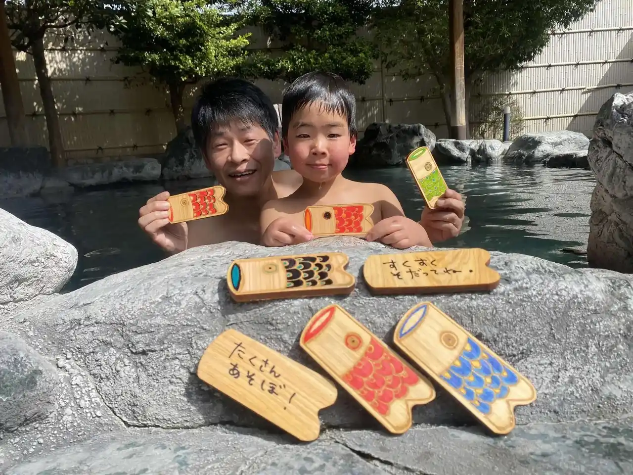 お子さまへ向けてメッセージを記入した、鯉のぼり型のヒノキがお風呂を泳ぎます。ヒノキの香りとメッセージをお楽しみください。 |