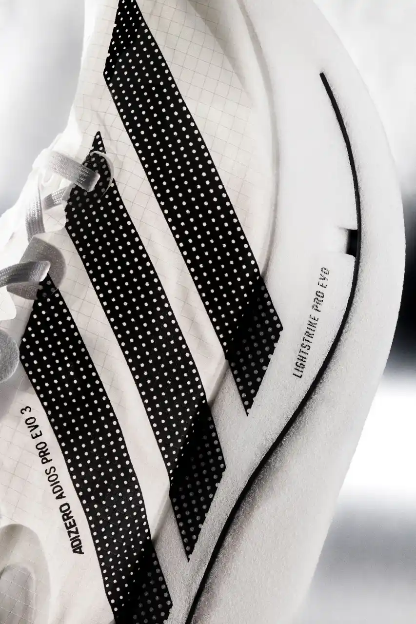 デザインは、前モデル「ADIZERO ADIOS PRO EVO 2」の流れを受け継ぎながらアップデートされています。ミニマルなホワイトのカラーリングに、ボールドなブラックのスリーストライプスを配置。ヒール部アウトソールには新たに搭載されたテクノロジー「ENERGYRIM(エナジーリム)」が見える仕様を採用しています。 |