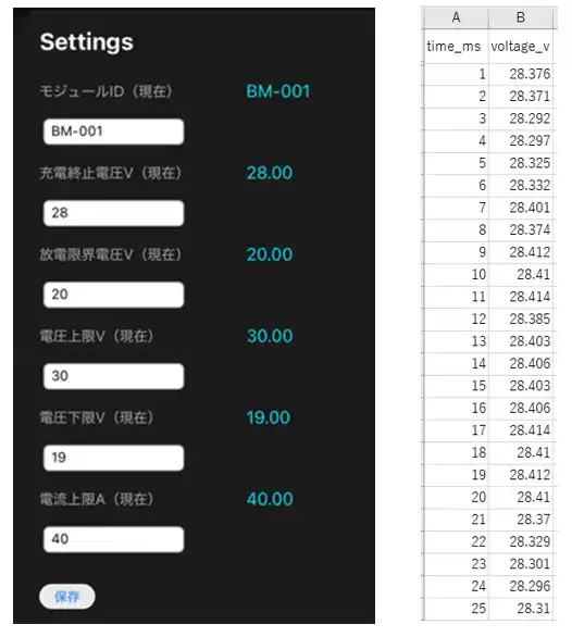 モジュール内部には、電圧および電流のログデータを蓄積する機能も搭載、バッテリの使用履歴の可視化や異常時の原因解析など、より高度な運用管理を実現します。 |