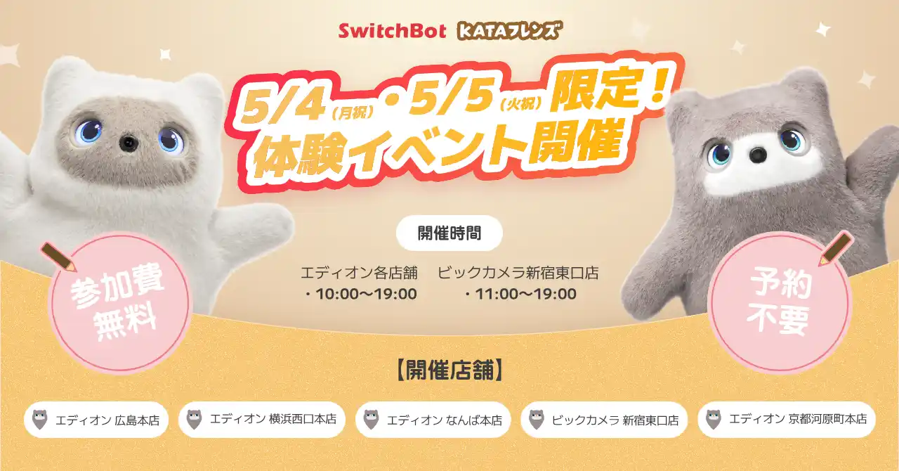 IoT・スマートホーム事業を手掛ける「IoTデバイスNo.1ブランド(※2022年11月 家電Biz調べ )」のSWITCHBOT株式会社(本社 : 東京都渋谷区)は、2026年4月17日(金)~5月10日(日)の期間、成長型AIパートナーロボット「KATAフレンズ」の「GWお迎え応援キャンペーン」を実施いたします。本キャンペーンでは、対象期間中にKATAフレンズ本体をご購入いただいた方に「ライトプラン6ヶ月無料」の特典を進呈するほか、抽選でAmazonギフトカードが当たるSNSフォロー&参加キャンペーンも開催。5月4日・5日には家電量販店5店舗にて実機を体験できるイベントを開催いたします。 |