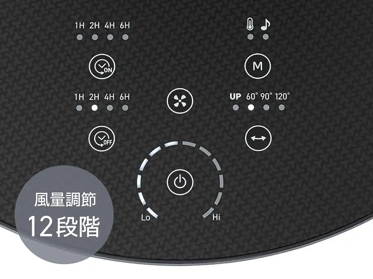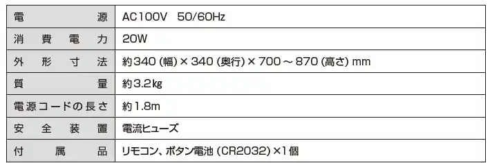 | ・12段階の豊富な風量調節。左右自動首振り約60/90/120°、上下手動首振り上約90°、下約10°。 | |||||||||