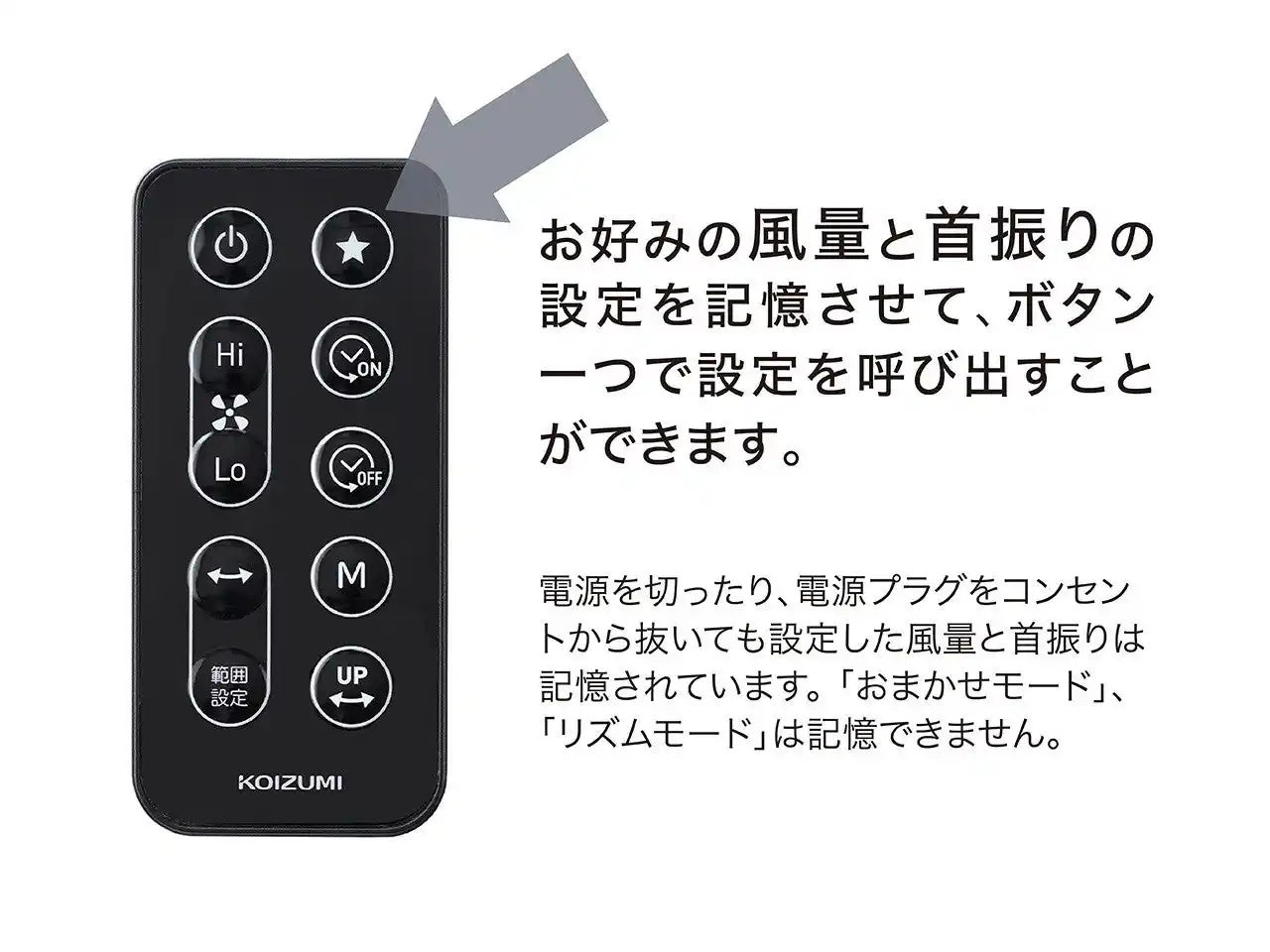 | ・「お気に入り設定」搭載。風量、首振りの状態を記憶させ、いつでもワンボタンで呼び起こせる。 | |||||||||