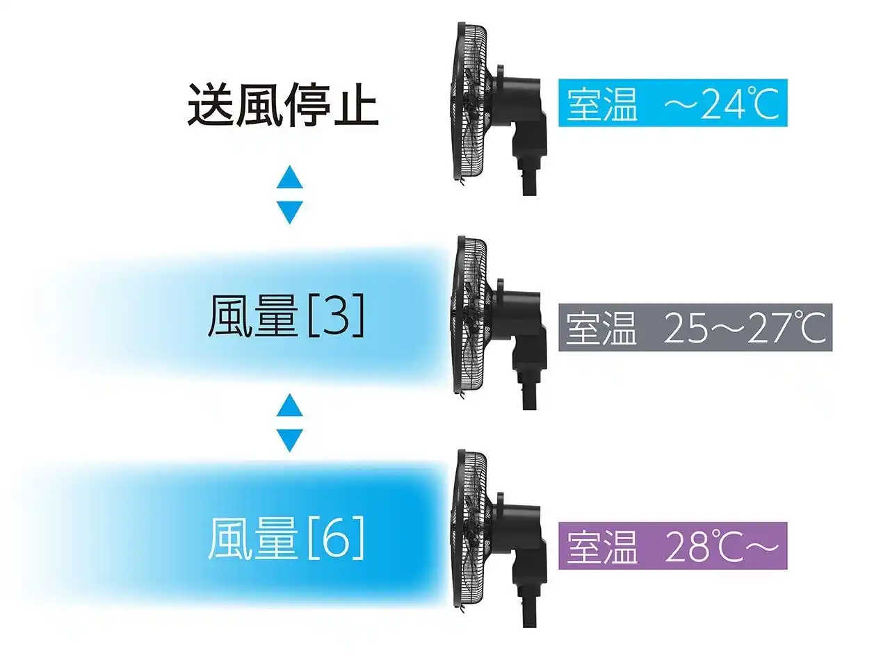 | ・「おまかせモード」搭載。温度センサーで室温を感知。室温に応じて自動で風量をコントロール。 | |||||||||