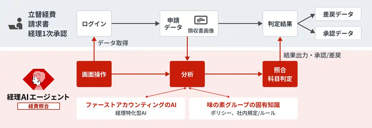 具体的には、AFSが受託する複数社分の経理承認業務を、AI活用を前提とした形で再構築し、ファーストアカウンティングが提供する経理特化型AIの技術に、同社が長年培ってきたAI OCRや証憑処理、業務自動化の技術(Remota/Robota等)を組み合わせ、味の素グループの業務ルールやナレッジを実装しました。この結果、経理承認に必要な一連の工程(ログイン~判断・承認)を自動化し、単純なルールではなく、会計知識に基づく柔軟な判断ができます。 |